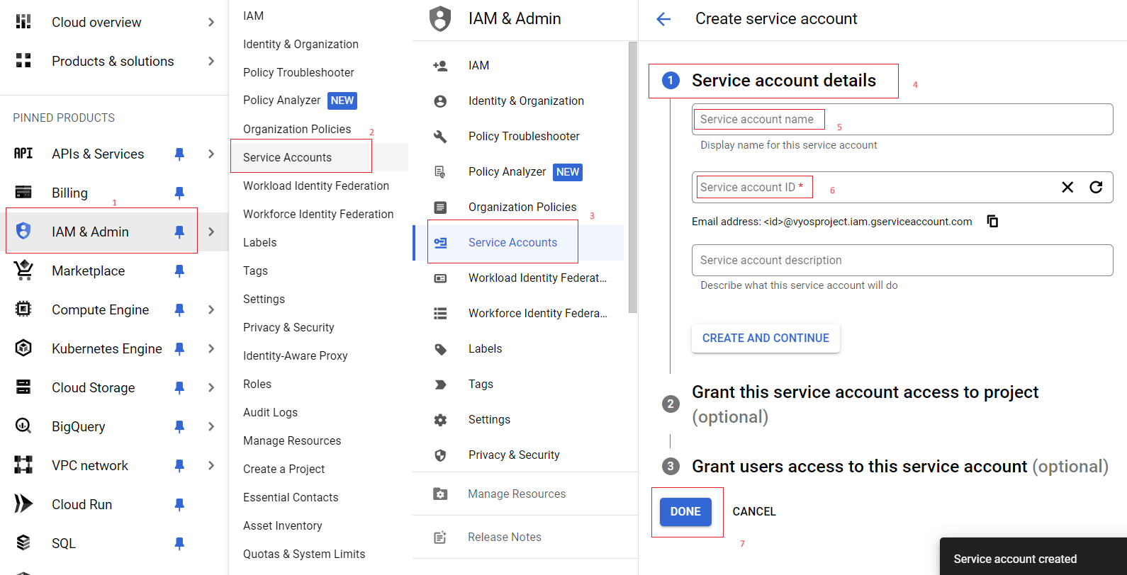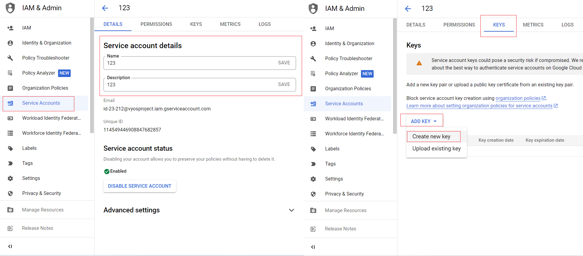 2 Create a service aacount and download your key (.JSON)