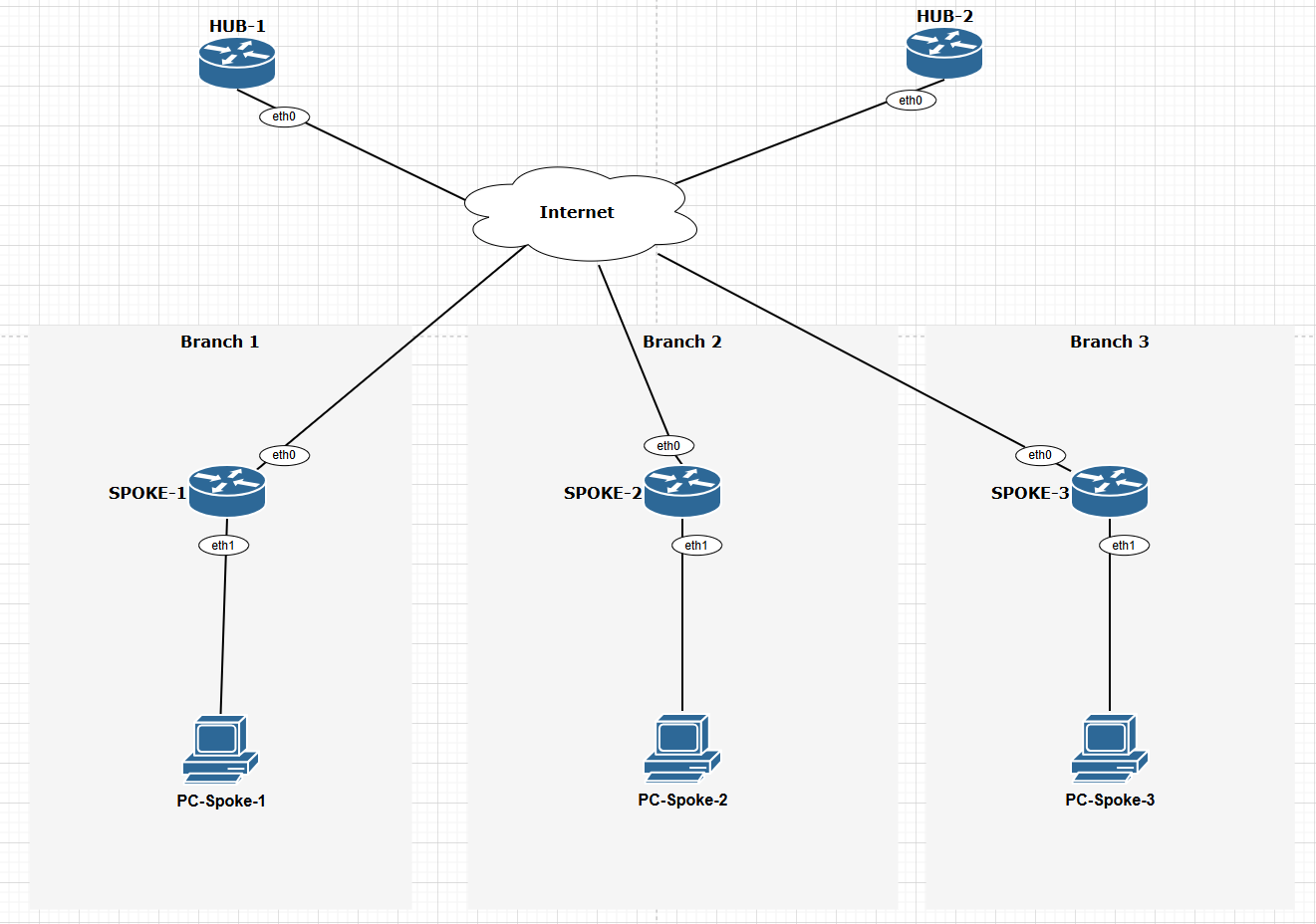 In this example we use VyOS 1.5 as HUBs and Spokes (HUB-1, HUB-2, SPOKE-2, SPOKE-3) and Cisco IOSv 15.5(3)M (SPOKE-1) as a Spoke.