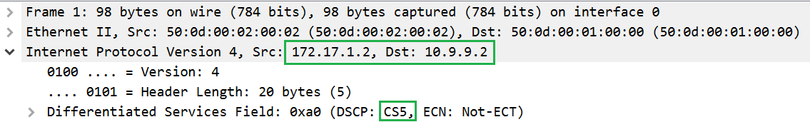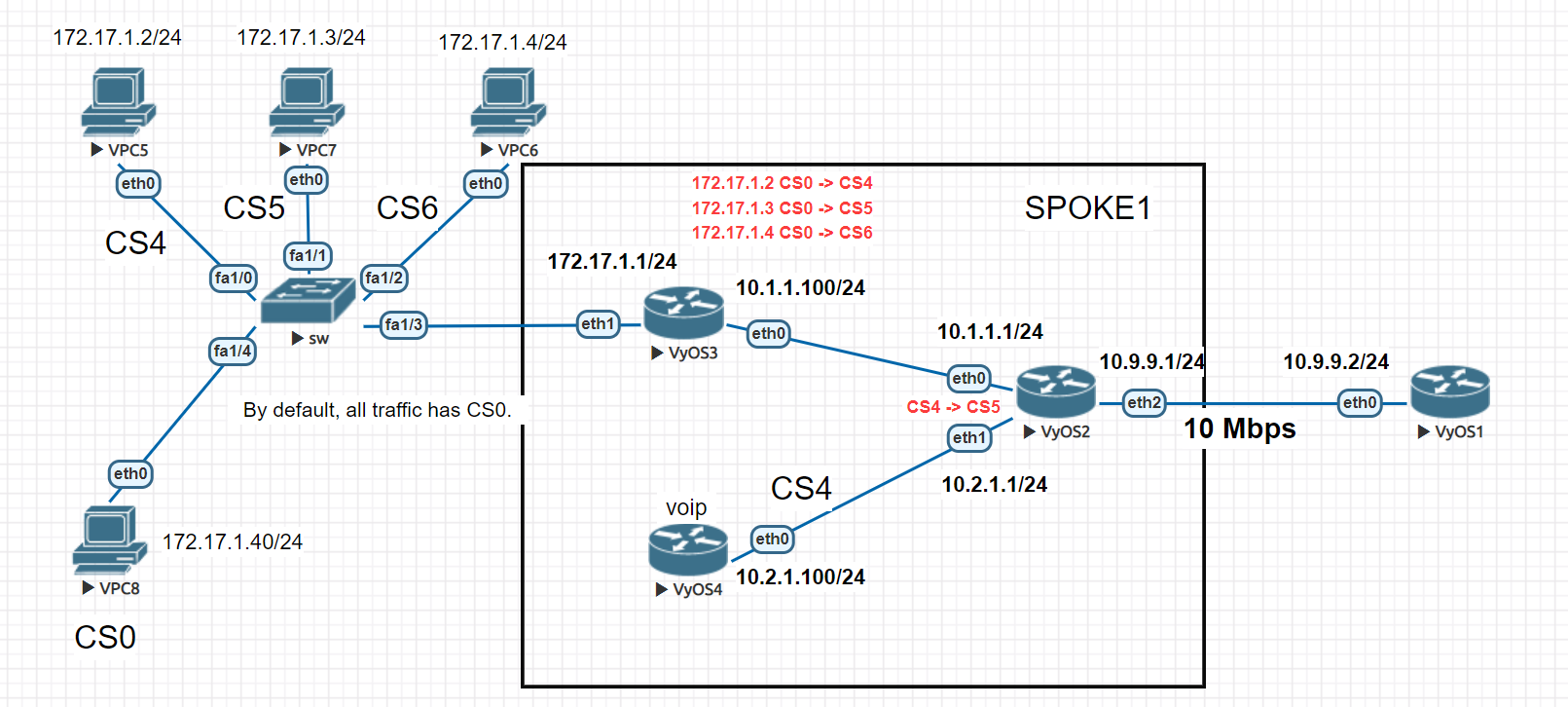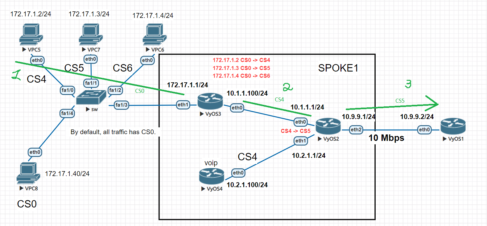 Set IP addresses on all VPCs and a default gateway 172.17.1.1. We’ll use in this case only static routes. On the VyOS3 router, we need to change the ‘dscp’ labels for the VPCs. To do this, we use this configuration.