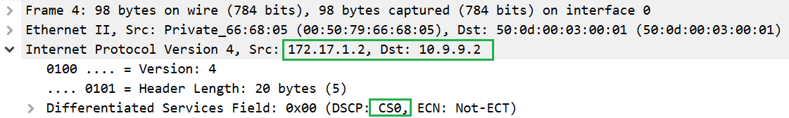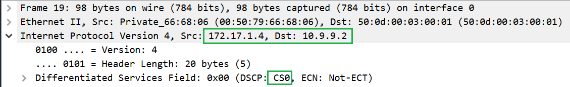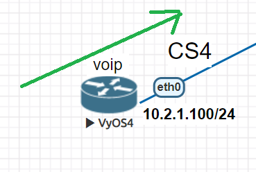 On the router, VyOS4 set all traffic as CS4. We have to configure the default class and class for changing all labels from CS0 to CS4