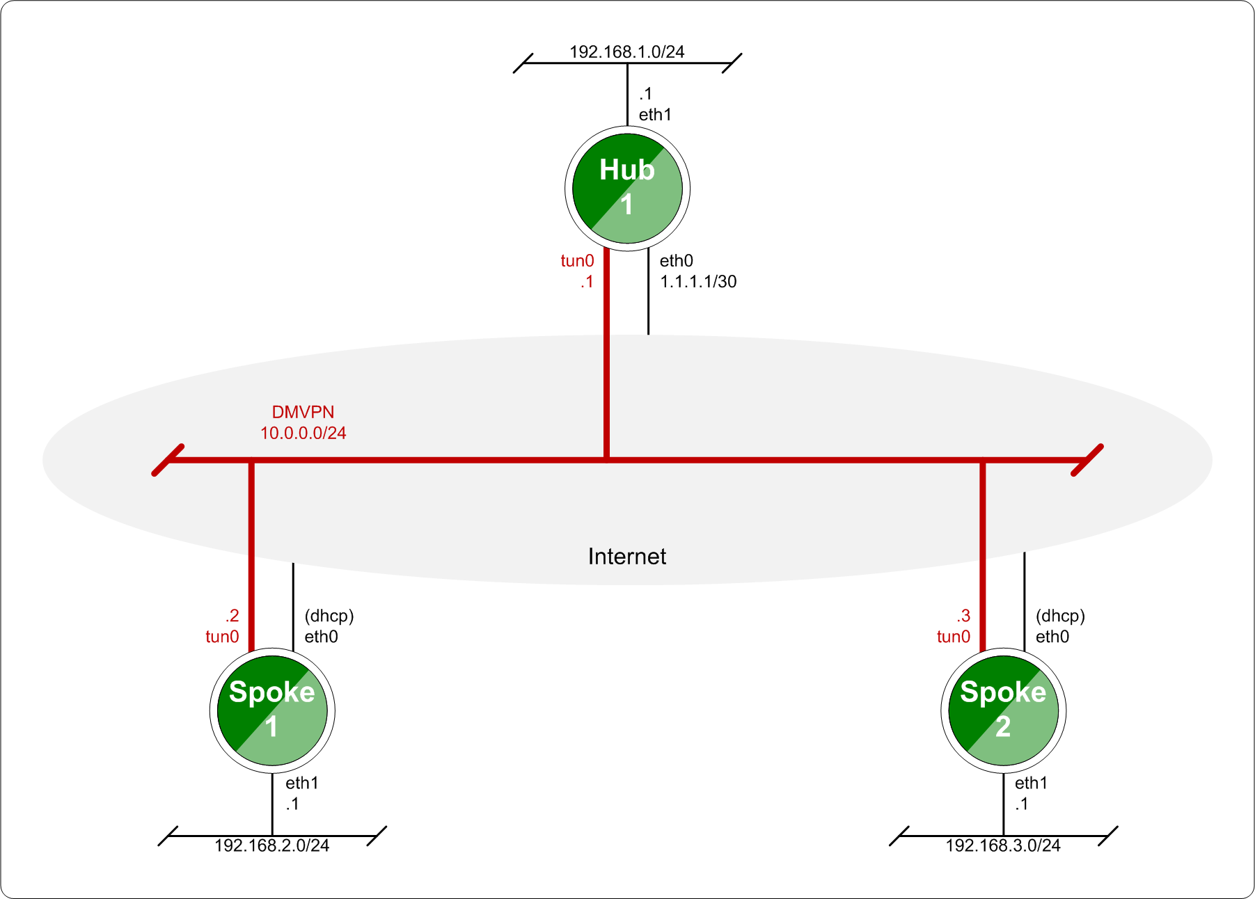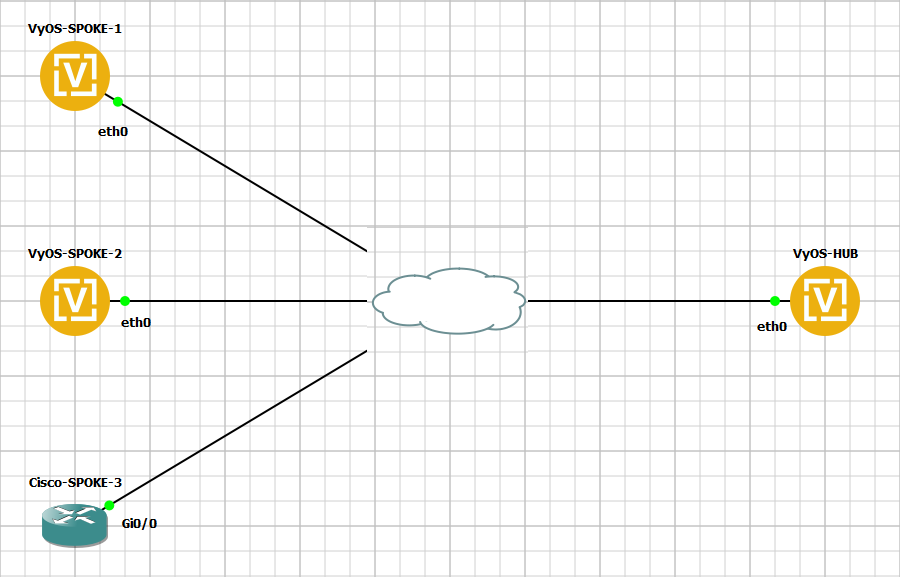 This blueprint uses VyOS as the DMVPN Hub and Cisco IOSv 15.5(3)M and VyOS as multiple spoke sites.