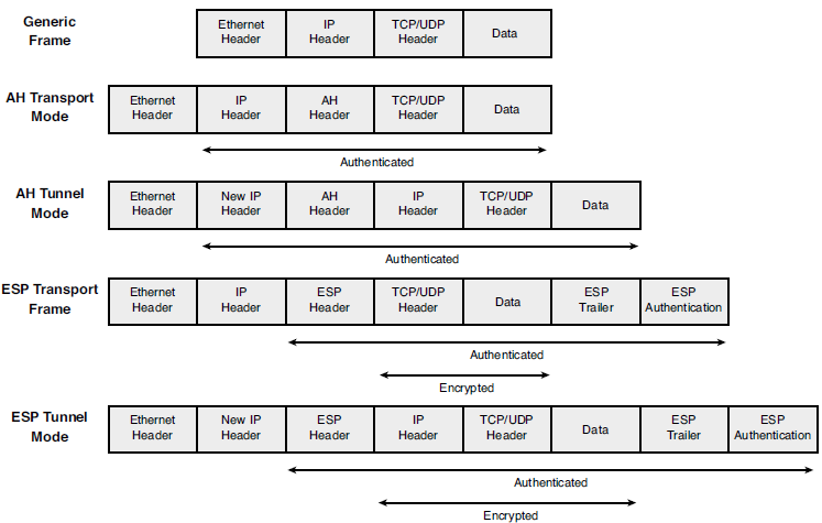 Authentication Header (AH) is defined in RFC 4302. It creates a hash using the IP header and data payload, and prepends it to the packet. This hash is used to validate that the data has not been changed during transfer over the network.